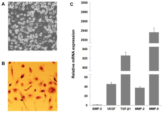 To explore the role of these cells in the angiogenic potential of CGF, we analyzed the release of pro-angiogenic factors. As shown in Table 3, CGF-derived cells released VEGF and TGF-β1, which reached values of 0.021 ± 0.007 and 1.5 ± 0.4 ng/mL, respectively. Furthermore, these cells produced matrix metalloproteinases and released MMP-9 and MMP-2 into the medium at concentrations of 109.6 ± 13.8 and 16.7 ± 3.7 ng/mL, respectively (Table 3). The expression pattern of pro-angiogenic factors in CGF-derived cells was confirmed by qRT-PCR analysis (Figure 5C).