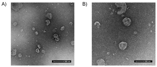 Representative transmission electron micrographs (TEM) of the liposomes. TEMs of the liposomes stained with uranyl acetate. (A) Representative TEM (lower magnification) demonstrating round shape and size with scale of 500 nm. (B) Representative TEM (higher magnification) demonstrating round shape and size with scale of 200 nm. The liposomes are roughly 250 nm in size, confirmed by dynamic light scattering.