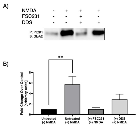 Previous studies have observed that NMDAR activation leads to increased interaction between PICK1 and GluA2 [18]. Treatment with FSC231 blocked the NMDA-induced increase in association between PICK1 and GluA2 (Figure 3). As a positive control, we have shown that FSC231 is able to inhibit NMDA-mediated PICK1–GluA2 association (Figure 3).