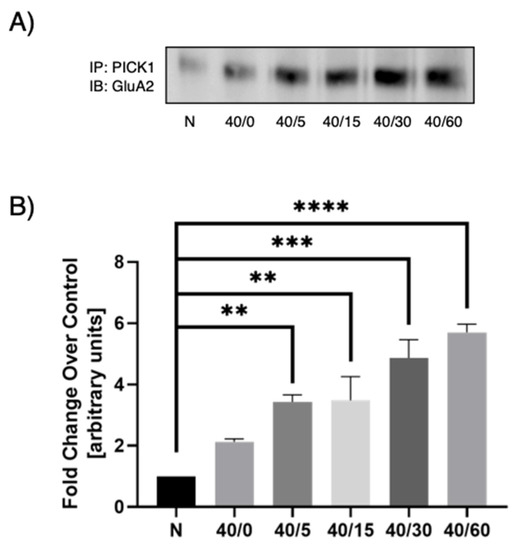 Previous studies under OGD conditions suggests that the GluA2 AMPAR subunit composition switch is dependent on PICK1 trafficking [26] and that this trafficking contributes to delayed neuronal death in OGD-induced hippocampal slices [19]. These conditions have not been examined under reperfusion conditions. To determine the time point at which to carry out our OGD/R experiments, we first conducted a time-response experiment in which we used 40 min OGD and increasing reperfusion times (0, 5, 15, 30, or 60 min). In previous studies [27], 40 min of OGD was determined to be optimal in hippocampal slices. PICK1 was immunoprecipitated from all samples and then immunoblotted for GluA2. We found an increase in PICK1–GluA2 association with reperfusion when compared to the normoxic control, with maximal association between 30 and 60 min of reperfusion (Figure 4). A reperfusion time of 30 and 60 min gave statistically significant results. In subsequent experiments, the 30-min reperfusion time point was used.