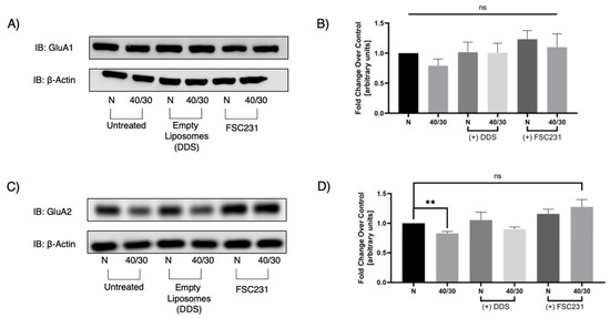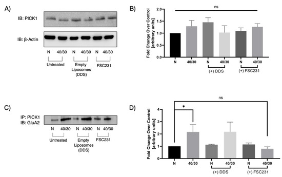 A concentration of 100 µM FSC231 was chosen as a drug-saturating concentration which is approximately 10 times the Ki (10.1 µM) of FSC231 for the PDZ binding domain of PICK1. This concentration was subsequently used in all the following experiments. The bin/amphiphysin/rvs (BAR) domain on PICK1 has been suggested to bind to liposomes of specific size [25]. Though the exact radius of liposomes capable of binding with BAR have not been elucidated, we performed all subsequent experiments in the presence of empty liposomes to determine if there were any BAR associated effects, as shown in the following figures. We found no changes between untreated controls and our empty liposome drug-delivery system with regards to the PICK1–GluA2 interaction. This suggests that the empty liposomes alone have no effect on the PICK1–GluA2 interaction.
