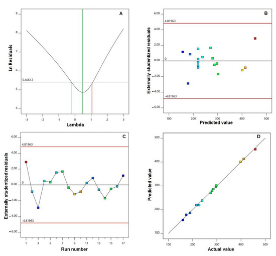 Diagnostic plots for globule size of PIC-BZ: (A) Box–Cox plot for power transforms, (B) externally studentized residuals vs. predicted values plot, (C) externally studentized residuals vs. run number plot, and (D) predicted vs. actual values plot.