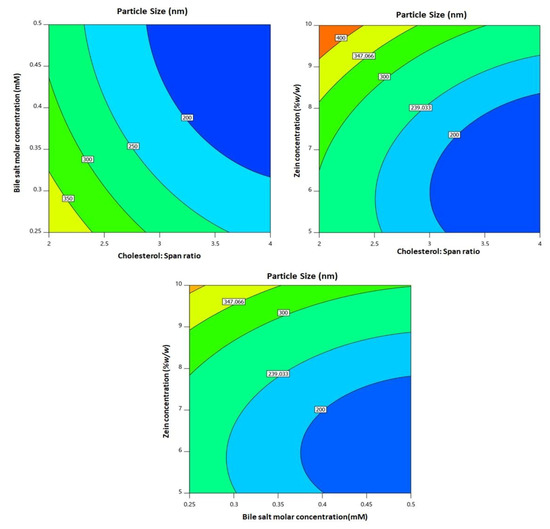 It can be seen that the particle size decreased at higher cholesterol/span ratio and bile salt molar concentrations, while it increased at higher zein concentrations.