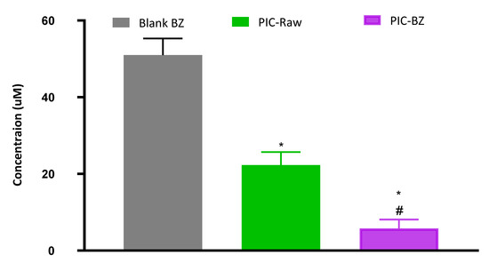 The MTT assay was used to evaluate the IC50 values in A549 cells. The results showed that IC50 values were significantly reduced for the PIC-BZ when compared to PIC-raw. The IC50 value for the PIC-BZ was 5.78 ± 2.3 µM, while it was 22.3 ± 3.4 µM for the PIC-raw and 51.4 ± 4.3 µM for Blank-BZ (Figure 5).