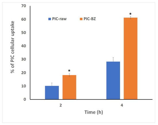 Cellular uptake of PIC from PIC raw and optimized PIC-BZ at 2 and 4 h. Data represent mean of six independent replicates SD. * Significantly different (p < 0.05) determined by Student’s t-test.