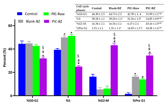 Impact of Blank-BZ, PIC-raw, or PIC-BZ treatments on A549 cell cycle phases with data table (inset). Data are the mean of 4 independent experiments ± SD. * Significantly different from control, p < 0.05; # significantly different from Blank-BZ, p < 0.05; $ significantly different from PIC-raw, p < 0.05.
