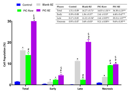 Impact of Blank-BZ, PIC-raw, or PIC-BZ treatments on the percentage of apoptotic or necrotic A549 cells with data table (inset). Total = apoptosis + necrosis; early = early apoptotic phase; late = late apoptotic phase. Data are the mean of 4 independent experiments ± SD. * Significantly different from control, p < 0.05; # significantly different from Blank-BZ, p < 0.05; $ significantly different from PIC-raw, p < 0.05.