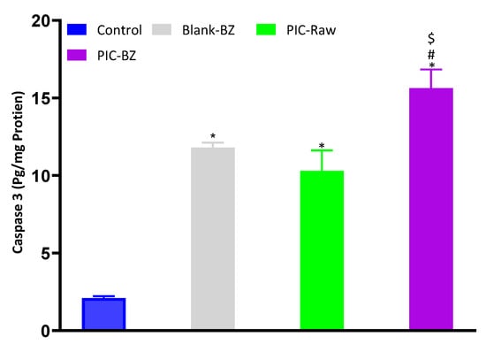 Figure 9 shows that treatment of A549 cells with Blank-BZ or PIC-raw induced a significant increase of caspase-3 compared to control cells (p < 0.05). As expected, the maximal enhancement in caspase-3 content was observed in the case of PIC-BZ treatment (p < 0.05 compared to all the other experimental conditions).