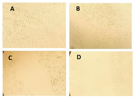 Wound coverage results of (A) untreated cells, (B) cells treated with blank-BZ, (C) cells treated with PIC-raw, and (D) cells treated with optimized PIC-BZ with 40× magnification.