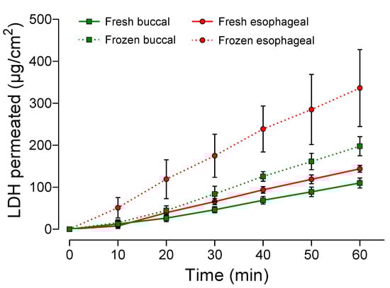 - Amores, S.; Domenech, J.; Colom, H.; Calpena, A.C.; Clares, B.; Gimeno, A.; Lauroba, J. An improved cryopreservation method for porcine buccal mucosa in ex vivo drug permeation studies using Franz diffusion cells. Eur. J. Pharm. Sci. 2014, 60, 49–54. [Google Scholar] [CrossRef]