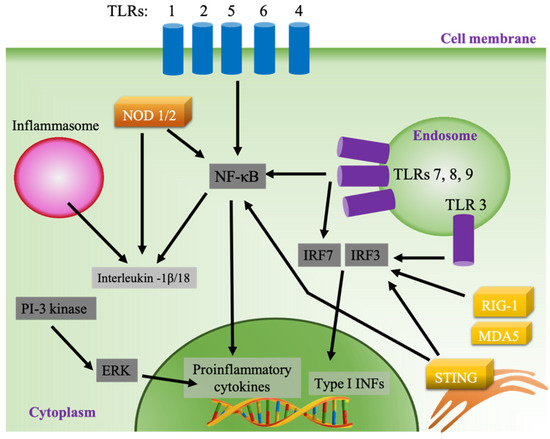 Vaccines act by inducing an adaptive immune response to protect against a pathogen by mimicking the naturally occurring infection without causing disease [53]. In contrast to viral infection, subunit vaccines lack the ability to activate the innate immune system, which is needed to successfully recognize and present antigens to adaptive immune cells. The inclusion of adjuvants in subunit vaccines has allowed for robust immunization against pathogen-specific antigens [54]. Synthetic adjuvants act by causing local inflammation, mainly by activating pattern recognition receptors (PRRs), which are expressed in different cellular compartments in innate immune cells [13,55,56]. One of the main classes of PRRs is Toll-like receptors (TLRs), which are expressed on the cell surface (TLRs 1, 2, 4, 5, and 6) or in the endosome (TLRs 3, 7, 8, and 9) (Figure 2). The activation of surface TLRs by pathogen-associated molecular patterns (PAMPs) subsequently activates the production of proinflammatory cytokine via the nuclear factor kappa-light-chain-enhancer of activated B cells (NF-κB) pathway through activation of myeloid differentiation primary response protein 88 (MyD88) [57,58]. Contrastingly, the activation of MyD88 when endosomal TLRs 7, 8 and 9 are stimulated results in the activation of interferon-regulatory factor 3 (IRF 3) and the production of type I interferons (IFNs), while stimulated TLR 3 produces type I INFs through the MyD88-independent pathway using TIR-domain-containing adapter-inducing interferon-β (TRIF) as its adaptor. Type I INFs are potent activators of lymphocytes, especially CD8+ T cells and cytotoxic T lymphocytes (CTL) [59,60]. In addition, endosomal TLRs 7, 8 and 9 activate NF-κB through a MyD88-dependent pathway (Figure 2). Cytosolic PRR represents another class of sensors that can be targeted by adjuvants, such as the retinoic acid-inducible gene I (RIG-I), RIG-I-like receptors such as melanoma differentiation-associated protein 5 (MDA5), and the endoplasmic stimulator of interferon genes (STING) pathways [61,62]. Adjuvants can also stimulate the secretion of chemokines and cytokines by activating other inflammatory pathways, such as the inflammasome and the extracellular-signal-regulated kinase (ERK) pathway (Figure 2) [63,64].