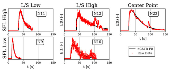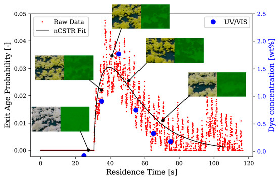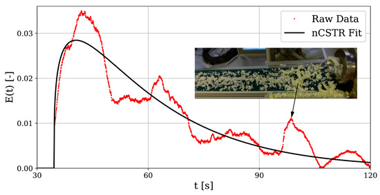 The curve was fitted by the continuously stirred tank reactor model (nCSTR) using the rtdpy package [35]. Two parameters, namely and n, were adjusted to approximate E(t) according to Equation (4).