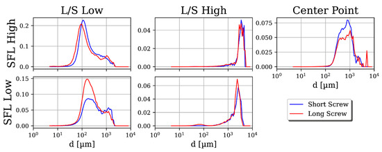 Volumetric probability density size distributions (q3) in a long and short screw setup for all combinations of low and high specific feed load (SFL) and liquid-to-solid ratio (L/S) parameters as well as a center point.