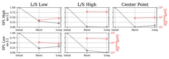 For most of the parameter combinations, the amount of fines decreases with increasing screw length, while the mean coarse particle size remains nearly constant or increases, except for low L/S and low SFL; see Figure 4. Thus, a long screw does not appear to further benefit granulation for the present formulation design space. Large specific shear forces for low SFL as well as local accumulations and attrition inside kneading zones could lead to an increase of fines because of higher friability at low L/S. The center point also shows an increase of fines, but at the same time, coarse particle’s d50 increases, which shows a superimposed effect of agglomeration and breakage or attrition. As a peristaltic pump was utilized, the liquid dripped into the barrel. Thus, it is not evident if attrition of especially large particles due to decreasing SFL or the inability to agglomerate particles due to poor liquid distribution—see Vercruysse et al. [23]—is causing a decreasing agglomeration rate for the long screw. However, for PSDs where the long screw curve is shifted to the left, i.e., to lower particle sizes, it is evident that attrition and breakage was the cause. Contrary to the findings of Vercruysse et al., when additionally varying SFL in the design space, fast granulation kinetics are observed. The second kneading section does not significantly contribute to agglomeration of particles. Most often, the mean particle sizes are lowered or constant during second kneading, which could be due to breakage and attrition in the long screw. Nevertheless, it is important to note that, for low L/S and high SFL, both less fines and more oversized particles were produced, emphasizing the importance of both parameters and the complex interplay between agglomeration, breakage, and attrition in the process. Furthermore, screw configurations in Vercruysse et al. differed from the one used in this study and are thus hardly comparable. Moreover, findings of Verstraeten et al. [15] about the necessity to include two kneading compartments for better liquid homogenization to allow further granulation of hydrophilic formulations cannot be confirmed as granulations kinetics seem to be faster than expected. As mentioned, scale and formulation of the investigations make results difficult to compare and it is not evident if other effects are superimposed, which emphasizes the need for an accurate simulation model that can account for particle and liquid interactions with screw geometries.