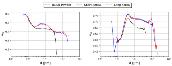 Sphericity and aspect ratio distributions over particle size for low L/S and low SFL for the initial powder, the short screw, and the long screw configuration.