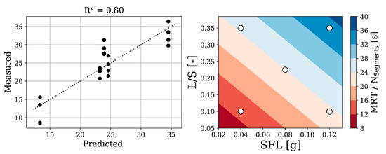 Left: Bilinear fit of (a = 123.46 s/g, b = 45.16 s, c = 3.89 s) with correlation plot between predicted and measured . Right: surface plot of predicted mean residence time (MRT) per repetitive screw segments. White dots indicate design space parameter combinations that determine predicted MRT for the correlation plot.