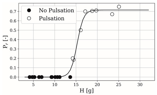Characterization of mass flow pulsations by fitting a logistic function (L = 0.715, = 15.268, k = 1.327), where white markers are experiments with a second peak and black markers without.