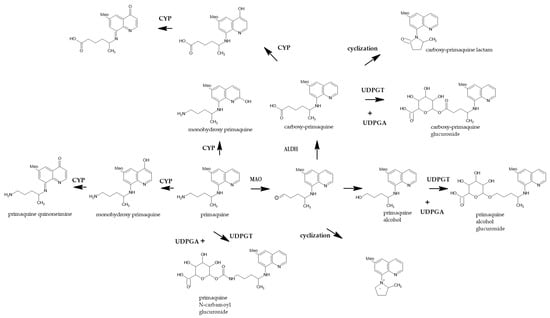 Primaquine is metabolized mainly in the liver by several enzymatic pathways, as shown in Figure 1. The polymorphisms in cytochrome P450 (CYP)2D6 phenotypes are known to affect the outcome of antimalarial treatment, especially in poor metabolizers []. Because the active metabolites generated via this pathway are unstable and difficult to measure, the information on their PK profiles and pharmacodynamic relationship is currently unavailable. Therefore, inferences about the PK characteristics of active metabolites cannot but be made on the basis of the PQ dose and CYP2D6 metabolic status []. Another enzymatic pathway for primaquine metabolism is the monoamine oxidase (MAO) pathway, which produces the main metabolite carboxyprimaquine (CPQ), whose anti-malarial effect is not fully known.