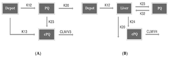 Schematic model. (A) Conventional population pharmacokinetics (PPK) model. K12 = (1 − Fa) × KA, K13 = Fa × KA, K23 = FMET × (CL/V2), K20 = (1 − FMET) × (CL/V2), K30 = CLM/V3. PQ, primaquine; CPQ, carboxyprimaquine; KA, absorption rate constant; FMET, fraction of conversion from PQ to CPQ; Fa, 1st pass effect; CLM, clearance of CPQ; V2, volume of distribution for PQ; V3, volume of distribution for CPQ; (B) Minimal physiology-based PK (PBPK) model. K12 = KA, K23 = QH × (1 − EH)/V2, K32 = QH/V3, K24 = CLMAO/V2, K20 = CLCYP/V2, K40 = CLM/V4. PQ, primaquine; CPQ, carboxyprimaquine; KA, absorption rate constant; CLCYP, clearance of PQ via CYP2D6 pathway; CLMAO, clearance of PQ via MAO (monoamine oxidase) pathway; CLM, clearance of CPQ; EH, hepatic extraction ratio; QH, liver blood flow; V2, liver volume; V3, volume of distribution for PQ; V4, volume of distribution for CPQ. ‘Depot’ denotes the absorption compartment.