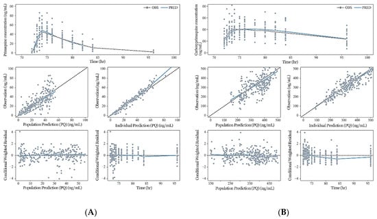 Plots for individual observations (blue) and predictions (red). (A) Primaquine, (B) Carboxyprimaquine.