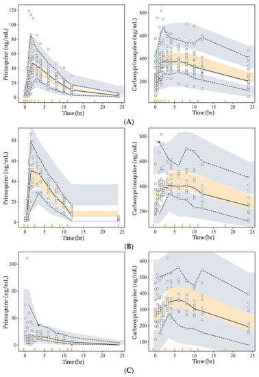 Visual predictive checks (VPC) of the final PK model for primaquine (PQ) (left) and carboxyprimaquine (CPQ) (right) obtained from 1000 simulations (upper dashed line: 95 percentile; middle solid line: 50 percentile; lower dashed line: 5 percentile). (A) VPC with data from both groups; (B) VPC with data from the normal weight group; (C) VPC with data from the obese group.