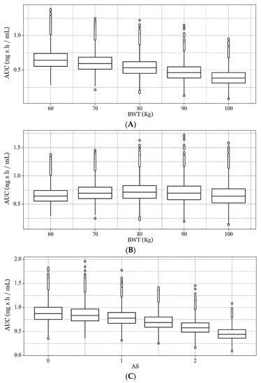 When examining virtual individuals with a BW of 60–100 kg, a median AS of 1.5, and height of 175 cm, the mean AUCPQ decreased by approximately 12% for every 10 kg. In contrast, when administration of a weight-normalized dose of 0.25 mg/kg was considered, the simulated AUCPQ became similar across all BW groups. Furthermore, AUCPQ declined with AS over an AS range of 0 to 2.5 (Figure 5).