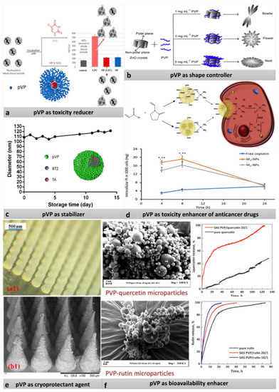 (a) Scheme of reduction of 5-fluorouracil of neutrophil extracellular traps by closing the drug into Amph-pVP. Adapted with permission from [82], Elsevier, 2020. (b) Influence of different concentration of pVP on the shape of ZnO-PVP nanoparticles. Adapted with permission from [76], Elsevier, 2019. (c) Antidegradation action of pVP. Adapted with permission from [83], Springer, 2020. (d) Scheme of the action of nanoparticles obtained by two different methods, and graph showing enhancement of cisplatin toxicity through increased intercellular accumulation of drug bonded with NP compared to free cisplatin (*—statistically significant difference (p < 0.05) from free cisplatin, **—statistically significant difference from M2-NPs). Reproduced with permission from [92], Elsevier, 2020. (e) Digital microscope (a1) and SEM (b1) images showing formulation of microneedles prepared from carvacrol- poly(caprolactone) nanoparticles with pVP as cryoprotectant agent. Reproduced with permission from [79], Elsevier, 2020. (f) Increased bioavailability of quercitin and rutin via covering drug with pVP. Reproduced with permission from [87], Elsevier, 2019.