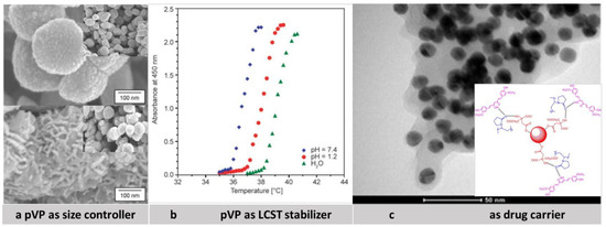 (a) Scanning electron micrographs of iron oxide powders synthesized in ethylene glycol at 140 °C for 2 h without pVP (top picture) and with pVP (bottom picture). Adapted with permission from [72], Elsevier, 2018. (b) LCST profiles of poly(NIPAAm-co-NVP) nanoparticles under simulated physiological conditions showing influence of pVP on LCST of polymers. Reproduced with permission from [96], Budapest University of Technology and Economics, 2019 (c) TEM images of pVP functionalized gold nanoparticles with curcumin and scheme of possible conjugation of Cur with pVP coated Au-Nps. Reproduced with permission from [62], Elsevier, 2012.