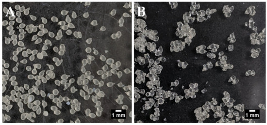 Manually-generated insulin-dWPI beads. (A) with Aerosil® drying, (B) without Aerosil® drying. Scale bars = 1 mm.