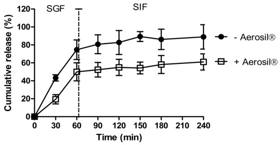 The effect of drying methods on insulin release from dWPI beads. Each point represents mean ± SD (n = 3; + Aerosil®), (n = 2; − Aerosil®).