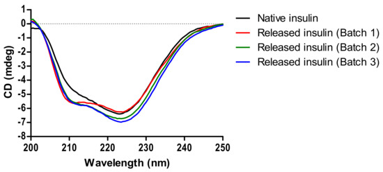 CD spectra of native insulin and bead-released insulin in SIF from three independent batches. Solutions were diluted to 10 µg/mL.