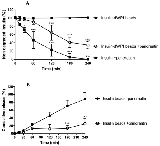 The degradation of insulin released from dWPI beads over 4 h in SIF and SIF supplemented with pancreatin. Data are presented as (A) the percentage of insulin remaining following exposure to pancreatin, and (B) the effect of pancreatin on the cumulative release of insulin from the dWPI beads. In both cases, insulin released in the absence of pancreatin was used as a control. Native insulin (1 mg/mL) was used to confirm enzyme activity. (Mean ± SD, *** p < 0.001 compared to insulin beads in the absence of pancreatin, (n = 3).