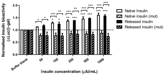 The ratio of luciferase and β-galactosidase expression in endogenous insulin receptor-expressing HepG2 cells transfected with wt (SynSRE-T-Luc) or mutant (mut, SynSRE-T-mut-Luc), following exposure to native and bead-released insulin. Data are presented as mean ± SEM, n = 3 individual bead batches. * p < 0.05, ** p < 0.01, *** p < 0.001 compared to buffer blank. Bracketed values compared responses from enriched and mutant cells.