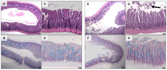 H & E (top) and AB & NR (bottom) staining of jejunal tissue following 2 h in vivo exposure to dWPI-insulin beads with and without C10. (A–D) prototype, (E–H) prototype + C10. Scale bars = 250 µm (A,B,E,F), and 100 µm (C,D,G,H). Arrow in G shows cell sloughing.
