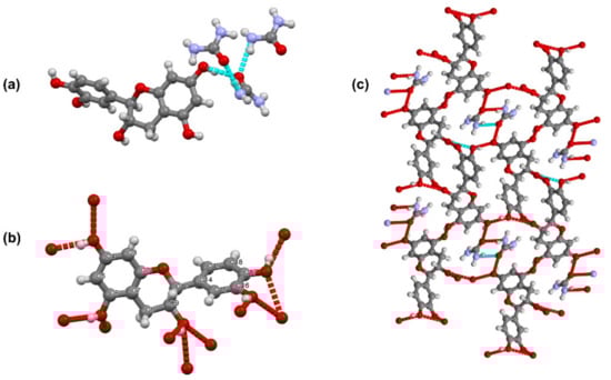 (a) Hydrogen bonding around a urea molecule in the UC cocrystal. (b) Hydrogen bonding around a catechin molecule in the cocrystal. (c) View along the a axis.