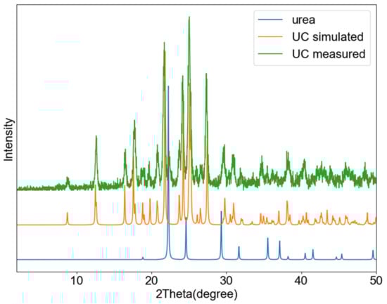 PXRD profiles of UC obtained by grinding (green), the simulated pattern of the UC cocrystal (orange), and urea (blue).