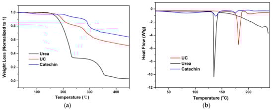 (a) TGA curves of urea, catechin and UC. (b) DSC curves of urea, catechin and UC.