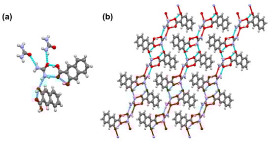 Urea and 3-hydroxyl-2-naphthoic acid crystallize in the monoclinic C2/c space group in a 1:1 ratio. The carboxylic acid of 3-hydroxyl-2naphthoic acid, is connected to the amide group of urea through an amide-acid hetero-synthon. The phenyl hydroxyl forms an intramolecular hydrogen bond, as well as an intermolecular hydrogen bond with urea (Figure 5). Other hydrogen bonding patterns involve different urea molecules and are of the C = O–H–N type (Figure 5).