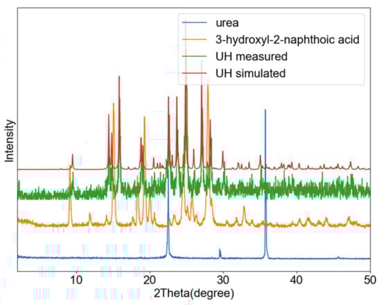 PXRD profiles of urea (blue), UH co-crystal obtained by grinding (green), the simulated UH pattern (red) and the experimental 3-hydroxyl-2-naphthoic acid pattern (orange).