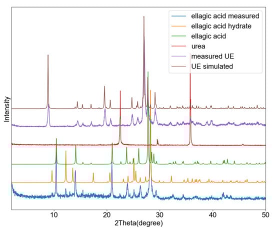 PXRD profiles of ellagic acid (blue), simulated ellagic acid hydrate (orange), simulated ellagic acid (green), urea (red), UE co-crystal obtained by grinding (purple), the simulated UH pattern (brown).