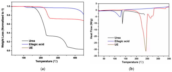 (a) TGA curves of urea, ellagic acid and UE. (b) DSC curves of urea, ellagic acid and UE.