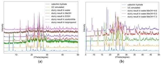 (a) PXRD profiles of congruence experiments results of UC in different solvents. (b) Various products obtained using different methanol/water ratio when suspending stoichiometric ratio of urea and catechin.