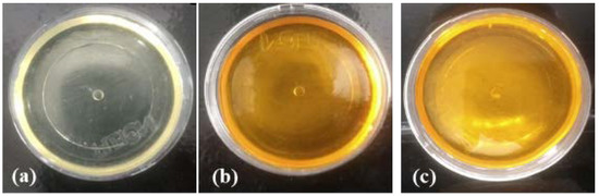 The material obtained in the form of a white micelle, which does not contain CUR, was characterized as a fluid and translucent liquid, in which the Tyndall effect was observed. On the other hand, a characteristic light-yellow color was observed in the micelles that presented CUR, and it would darken gradually with the increase of the CUR concentration.