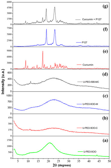 The X-ray of the materials synthesized from the U-PEO, CUR, and micelles (P127) demonstrate an amorphous pattern and the disappearance of the CUR and the P127 peaks, suggesting dispersion of both in the material, hence corroborating the visual characteristics.