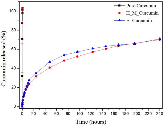 In the literature, several nanostructured systems have been used to improve CUR release profiles, such as the research conducted by Anitha et al. (2011) [52], using nanoparticles (NPs) as a new release system. The authors mention that the release pattern of the drug showed a burst release in the first 3 h, followed by a controlled release of CUR over a period of one week, in which about 70% of the drug was released during that time. The CUR that is adsorbed on the surface of the NPs, and the drug trapped near the surface may be the reason for the initial burst release. Since the rate of dissolution of the polymer near the surface is high, the amount of drug released will also be high. For Sahu et al. (2011) [51], who used polymeric micelles as a source of a new release system, relatively quick release occurred in the first stage, followed by a sustained and slow release over a prolonged period of up to 10 days. During the first 4 h, there was a 5% release of the Pluronic F127 micelles. After that, the release was slow and sustained and, finally, at 240 h, 63% of the drug was released from the Pluronic F127 micelles.