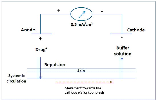 Iontophoresis is the permeation of ionized molecules through skin membranes using an external electric current [,]. It can reversibly allow the transdermal permeation of charged drug molecules that are largely unable to penetrate lipophilic skin membranes. It is a non-invasive and pain-free method that can provide systemic administration while eliminating problems encountered with the oral route. Several studies reported the enhanced iontophoretic transdermal permeation of drugs, such as dexamethasone sodium phosphate [], ketoprofen [], and lidocaine hydrochloride [].