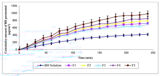 The cumulative amount of BH permeated across rat skins after 3 h (Q180), from BH hydrogels (not containing permeation enhancers), can be arranged in the following ascending order: F3 (598.99 ± 5.24) < F1 (652 ± 8.06) < F2 (706.41 ± 5.14) < F4 (742.04 ± 5.67) < F5 (900.57 ± 8.79) (µg/cm2). Their fluxes were 171.28 ± 1.64, 179.86 ± 0.16, 198.10 ± 2.36, 212.62 ± 1.34, and 245.65 ± 1.76, µg·h/cm2, respectively. It is clear that iontophoretic permeation of BH was significantly enhanced from these hydrogels compared to BH solution (Figure 3). Results also showed that F5 composed of HEC as gelling agent acquired the best permeation parameters among them. It also showed the highest Q240 (982.61 ± 7.04 µg/cm2) with Kp value equivalent to (0.02457 ±0.00018). HEC is a characteristic cellulose ether derivative that is widely used for its safety and biocompatibility []. Several studies reported the potential of cellulose polymers for trans-mucosal transport of drugs [,]. They allow wetting of skin surfaces resulting in enhanced permeability. Therefore, based on the aforementioned results, HEC was chosen as the gel matrix for incorporating different hydrophilic permeation enhancers.