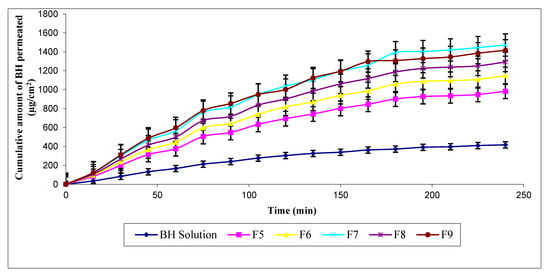 The mean cumulative amount of BH (Q) permeated into the receptor compartment, per unit surface area of rat’s skin (µg/cm2) was plotted versus time (h). The steady state flux, Jss (µg·h/cm2), was calculated from the slope of the linear portion of the plot []. Moreover, the apparent permeability coefficient (Kp) was calculated utilizing the following equation [,]: