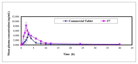 BH mean plasma concentration time profiles following transdermal iontophoretic delivery of F7 and administration of single oral dose of Concor® tablets (5 mg) to six healthy human volunteers are shown in Figure 5. Related PK data are summarized in Table 5. The mean Cmax determined from the selected hydrogel, was 1.9-fold higher and statistically significantly different (p = 0.0001) compared to Concor® tablets. In addition, the mean determined Tmax was smaller (2.00 ± 2.00 h) and statistically significantly different (p = 0.002) compared to the conventional tablets. The AUC0–40 values after transdermal and oral treatments were 43.19 ± 3.31 and 21.44 ± 3.60 ng·h/mL, respectively. Statistically significant difference was found between the two values (p = 0.0001), where the calculated relative bioavailability of BH after transdermal iontophoresis was about 201.44%, relative to Concor® tablets. The significant higher values of both Cmax and AUC0–40 together with the significant lower value of Tmax compared to the conventional oral tablet confirm the enhanced transdermal transport of BH through combined action of permeation enhancers and iontophoresis. This could be due to the loosened structure of SC layers caused by their dual effect, which correlates well with the previous ex vivo permeation results. On the other hand, the mean elimination half-life (T1/2) and the mean residence time (MRT) were found to be insignificantly different (p > 0.05) for F7, compared to oral tablets. These results strongly cohere with the PK theory, where drug elimination is not affected by enhanced drug permeation and absorption. Similar findings were reported by Fouad et al. in their study on sublingual and intranasal delivery of dapoxetine hydrochloride versus commercial oral tablets [].