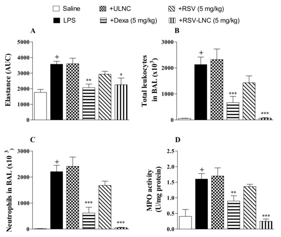 Effect of treatment with RSV or RSV-LNCs on AHR and pulmonary inflammation induced by LPS instillation. Mice were orally treated with ULNCs, Dexa, RSV, or RSV-LNCs (5 mg/kg) 6 h after intranasal exposure to LPS (25 μg/25 μL). (A) AHR was measured 24 h after LPS instillation and is represented as the area under the curve (AUC) obtained from the mean values of methacholine concentration aerosolization (3–27 mg/mL). After AHR measurement, cells were collected by bronchoalveolar lavage for (B) total leukocyte and (C) neutrophil counts. Then, lungs were perfused and collected to measure (D) MPO activity. Data are expressed as the mean ± SEM from 5–8 animals. + p < 0.05 compared with the saline group; * p < 0.05, ** p < 0.01 and *** p < 0.001 compared to the LPS group.
